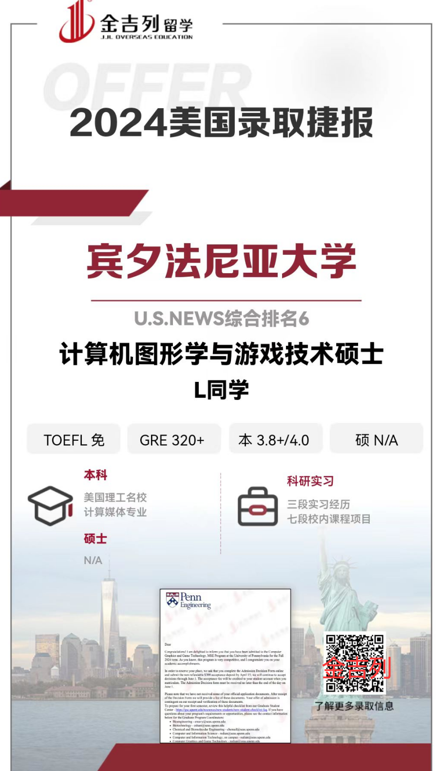 L同学是美国理工名校的计算机媒体专业,绩点是3.8+/4.0,无T,有G是320分以上,有3段实习经历,7段校内课程项目。L同学除了录取了宾夕法尼亚大学的计算机图形学与游戏技术硕士之外,还录取了密歇根大学安娜堡分校的信息硕士等。