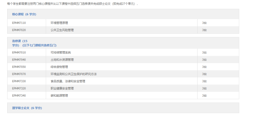 学生必须完成 该课程共 27 学分, 其中包括完成 2 门核心课程(共 6 学分)、5 门选修课程(共 15 学分)、硕士论文(6 学分),并在持续评估和笔试中取得令人满意的成绩。学生必须获得至少 2.50 的累积 GPA 才有资格获得理学硕士学位。