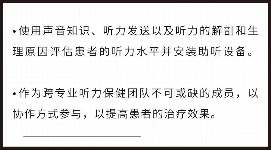 他们进行全面的 诊断听力评估 ,制定 听力保健计划 ,分配先进的 数字助听设备 ,并使用基于证据的验证方法评估结果。