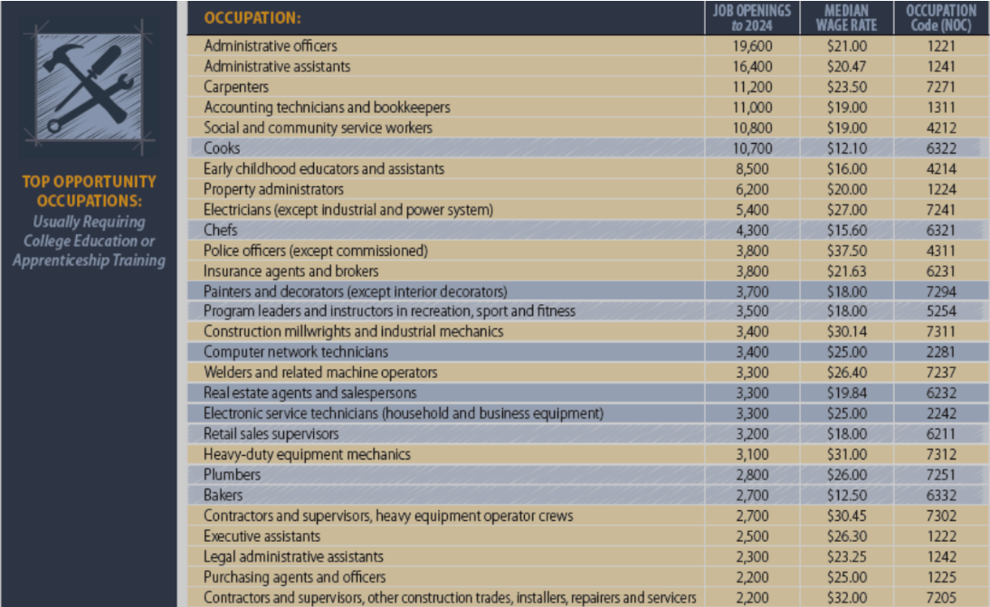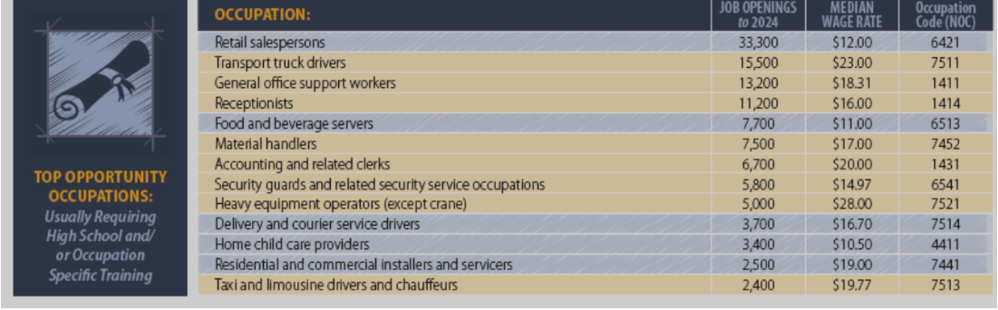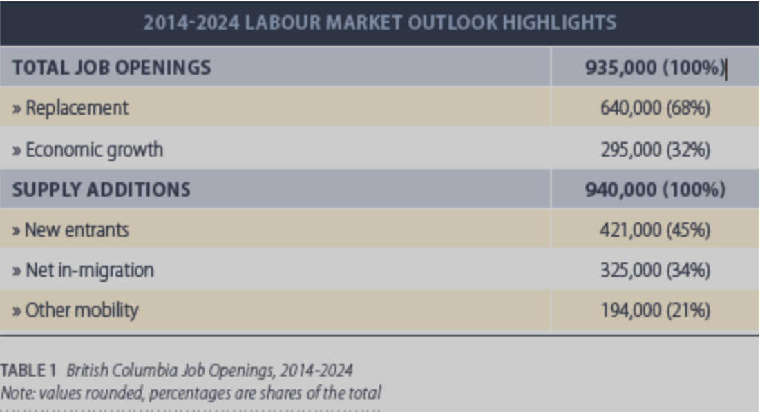 图1: 根据预测,BC省的经济将迎来一个稳定增长的十年。扣除通货膨胀后的实际国内生产总值(即经济增长量度)预计将以每年平均2.2%的速度增长至2024年。就业增长预计为1.2%。这些预测与BC省财政部和BC省统计局的预测一致。