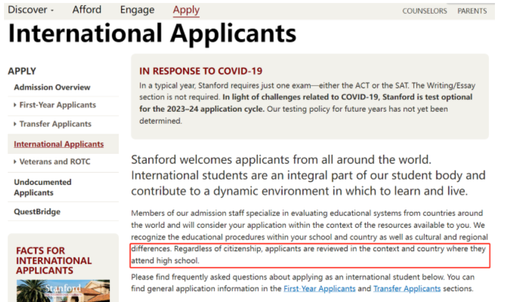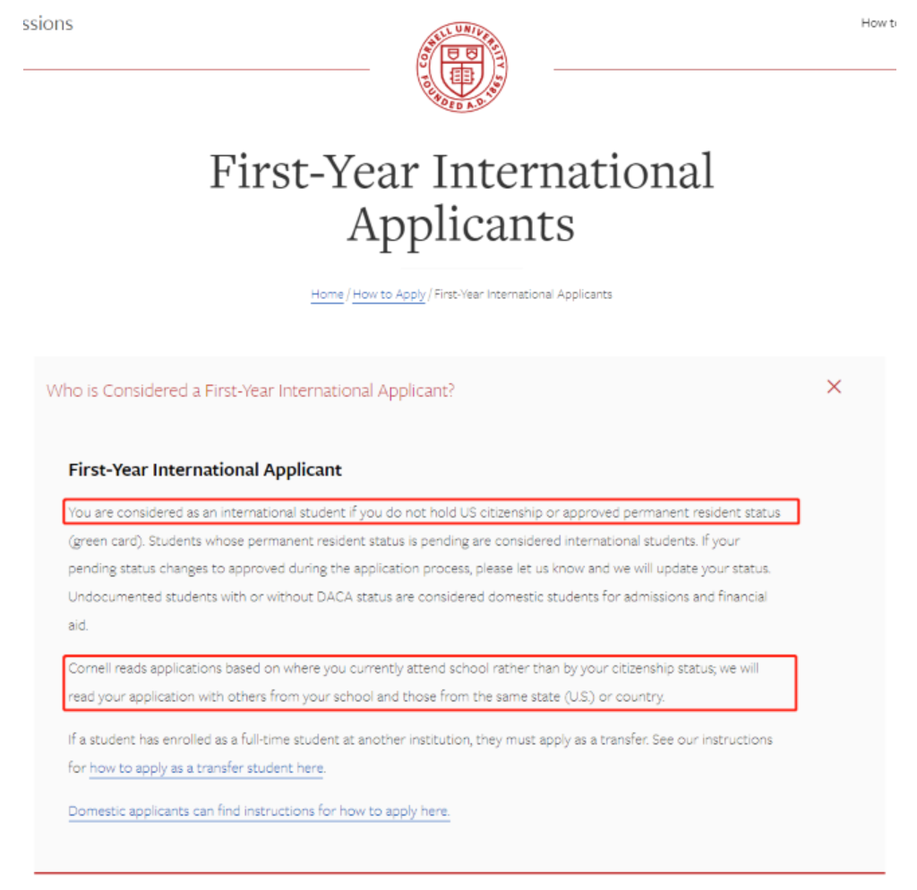但不同的学校仍会有细微的差别。例如康奈尔大学就在信件中表明: Cornell reads applications based on where you currently attend school rather than by your citizenship status; we will read your application with others from your school and those from the same state (U.S.) or country.