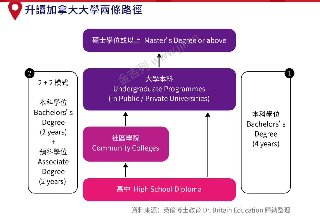 加拿大学制与香港一样为“三三四”,初中三年、高中三年、大学四年。香港留学生升学加拿大大学主要有两条路径:(1)大学加拿大现有85间公立大学,这些学府在质素上有保证并差异不大。大部分大学提供3 种类型学位:学士、硕士及博士。大学的学士学位可以分以下两种:普通学士学位(General Bachelor‘s Degree)一般为3或4年全日制课程,视乎课程或省政府需求而定;荣誉学士学位(Honours Bachelor’s Degree)提供较专门的课程,及需要更佳学业要求,某些大学要求多修读1年。(2)社区学院/实用工艺及科技学院/大学学院加拿大现有135间上述的公立学院,此类学院多属省立,是为适应社会的需要而设立,提供应用美术、商科、工科及职业训练等课程。修业时间由1至__3年不等,毕业后获发证书或文凭。