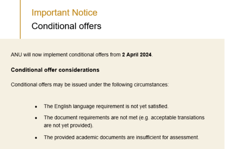 从4月2日起,申请该校本科或硕士的学生,可以无语言获得有条件录取,后补语言成绩(仍需达标)后换无条件offer。硕士申请,如果语言和文件满足条件,七个学期(四年制)可发放无条件录取,医学类的不在内。这就意味着同学们可以提前进行申请,不用担心语言成绩暂时不够,有更充足的时间去准备语言成绩!在以下情况,ANU国际招生团队可以发放Conditional Offer有条件录取通知书: