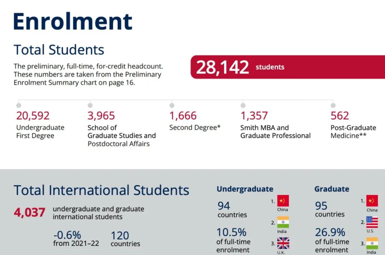 女王大学在2021年年底发布的《2022-23 Enrolment Report》可以看到,学校去年总共招收的本科学生(选择在Queen’s完成第一个学位的)为20592名,相比于2021-22学年,这个数字上升了500多名。在所有在校的本科生和研究生中,共有4037名国际学生,来自120个国家,其中中国是留学生来源最多的国家。