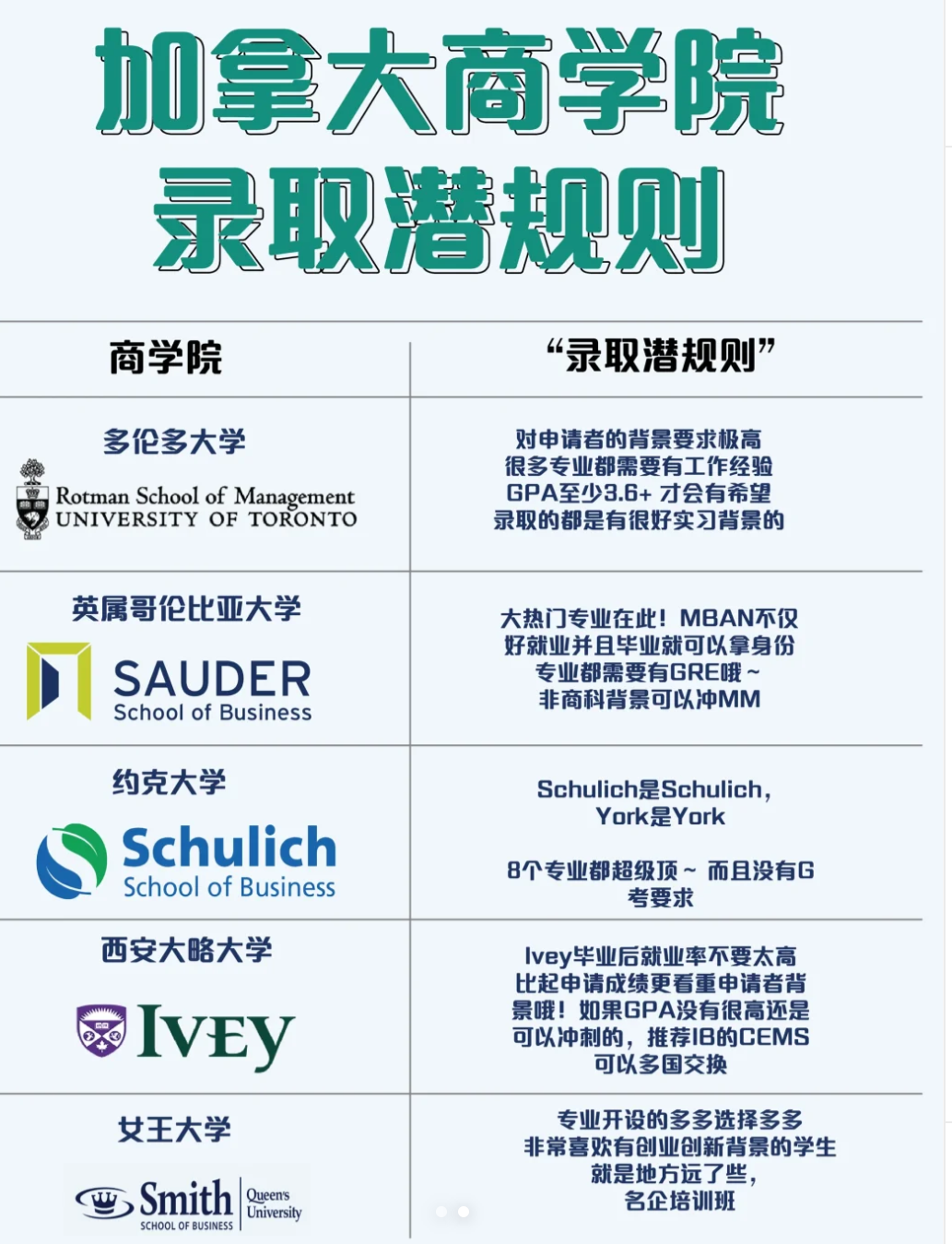 3.加拿大商学院非常知名,比如UT的rotman商学院,UBC的sauder商学院,western的Ivey商学院,York的schulich商学院,以及Queens的smith商学院。