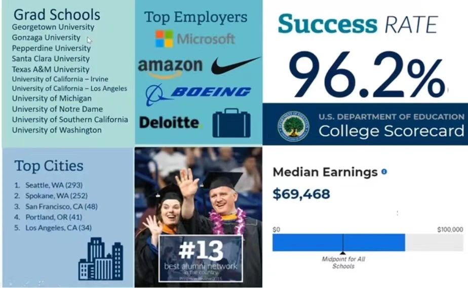 贡萨加大学-毕业成就: 贡萨加大学的国际学生毕业率96.2%,毕业薪资中位数可达到7w美金一年,高达为国际学生提供了进入如亚马逊、耐克、波音以及微软等知名企业的通道。