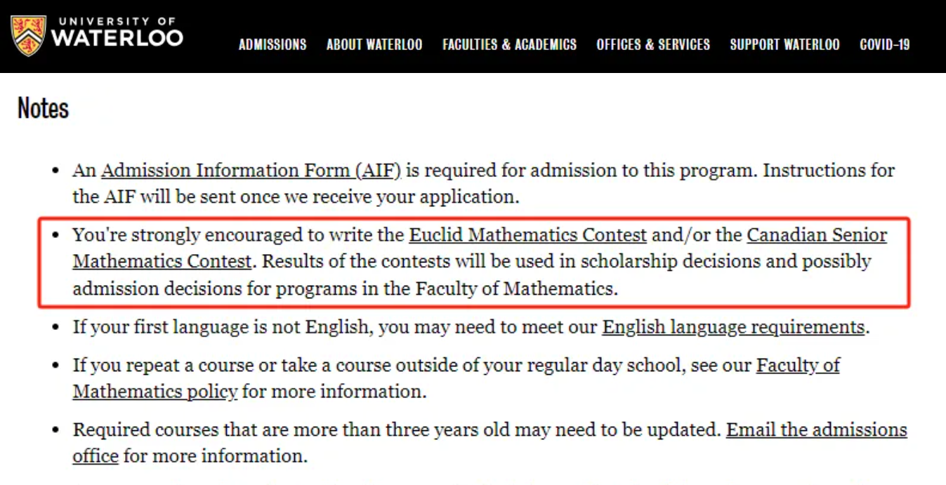 滑铁卢大学本科理工类专业强烈建议申请人参加欧几里得数学竞赛及其他竞赛,提高学生自我竞争力。