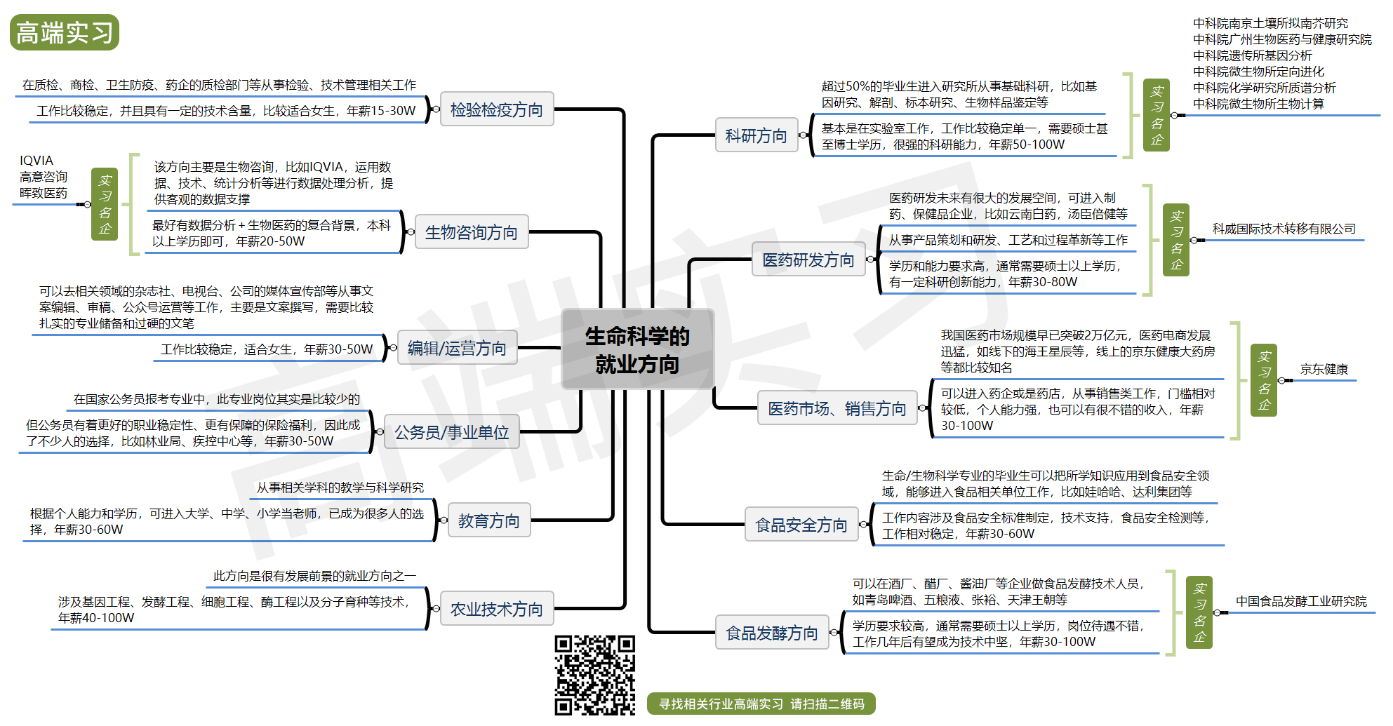 主要从检验检疫方向、生物咨询方向、运营方向、公务员、事业单位、教育方向、农业技术方向、科研方向、医药研发方向、医药市场、销售方向、食品安全方向、食品发酵方向等方面进行介绍。