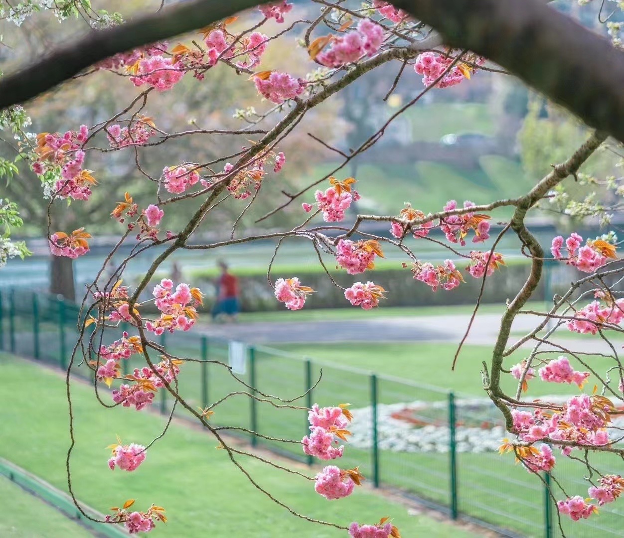 粉红色的樱花、各色的郁金香、黄色的水仙花
