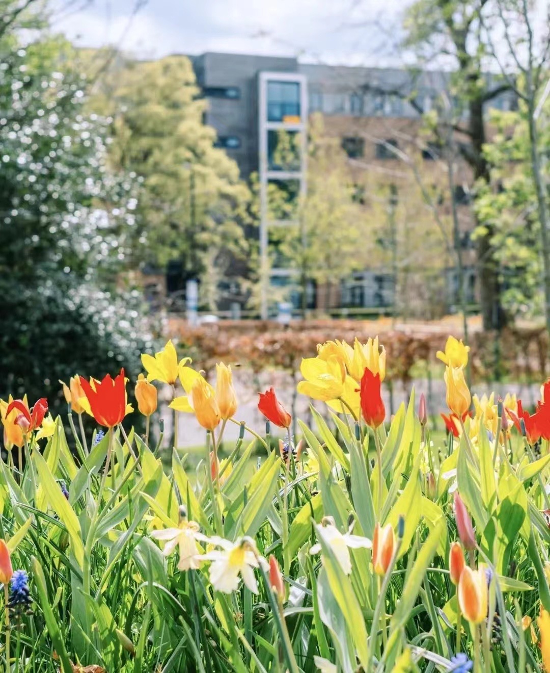 春日,不少花儿都开了,五彩缤纷的花海扑面而来,点缀了整个校园
