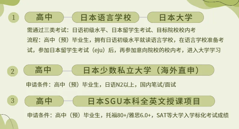 无论高中专科本科研究生,甚至职中生等都能在日本找到适合的留学方案。日本的留学途径也很多,申请大学院研究生、语言学校、专门学校等,还有英文授课SGU项目等。