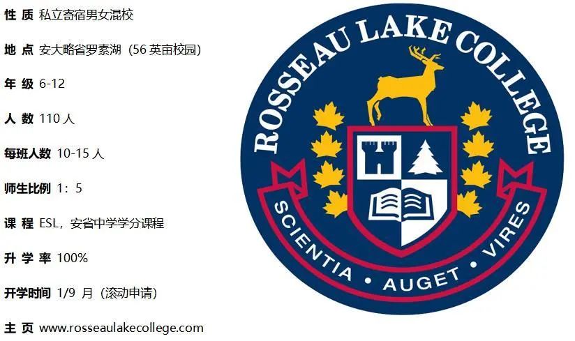 Rosseau Lake College罗素湖中学成立于1967年,在当地是一所口碑很好的私立贵族寄宿学校,所有的教职员几乎都住在学校内,为学生提供了更多与老师沟通的机会。学校 学校开设了数学、科学、物理、生物、法语、英语、艺术、音乐、戏剧等课程, 大部分的班级/课程规模大约只有10个左右学生。 为了加强学生的学习,每晚都会有晚自习的时间,并有老师值班,如果学生有问题随时可以得到最佳解答。 每周五为探索日,每个学生参与到个性化的课题研究中。 涉猎广泛、经验丰富的老师教授学生多元化的知识,培养学生在激烈竞争中的领导和独立能力。