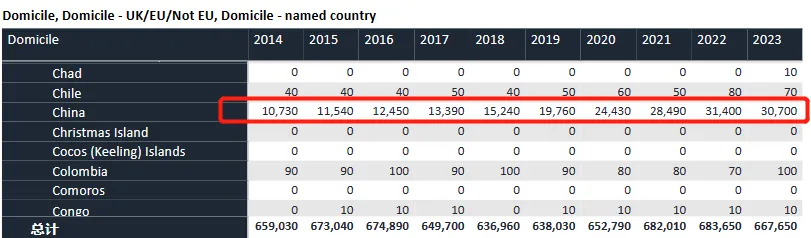 根据UCAS官方公示,从2014年到2023年,中国学生申请人数从10730人,直接飙升至30700人,增长了186%。