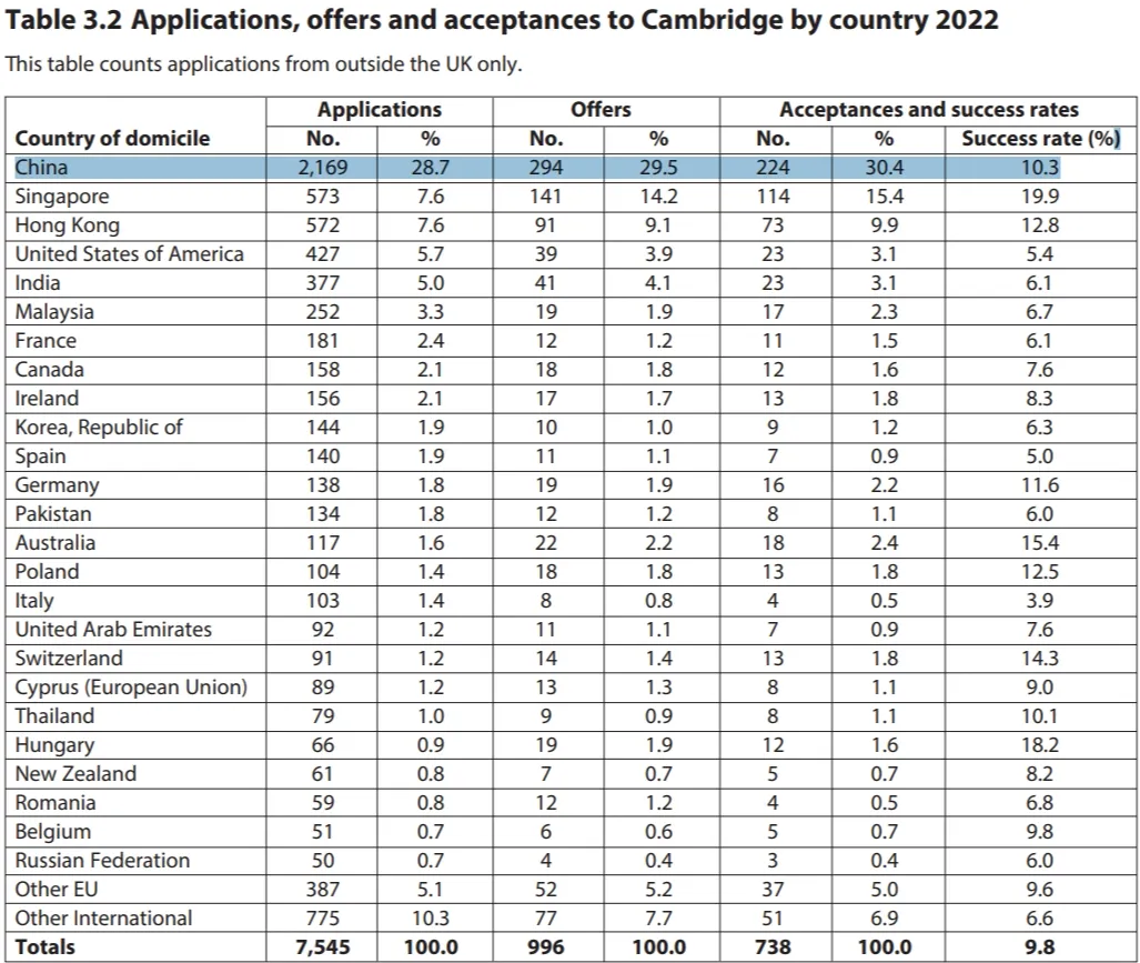 2022年剑桥大学已公布的数据中可以看出,中国大陆学生申请人数(2169人)和录取人数(294人)最多,以绝对优势位列第一。