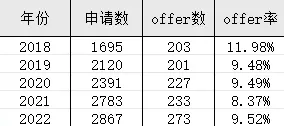 相比22/23年的offer率(11.2%)高了1.6%,比21/22年(8.6%)高了4.2%。中国学生的offer率逐渐上升。