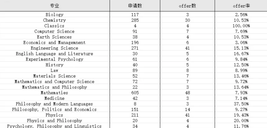 - 化学系、物理系、电子电气工程系紧随其后,申请人数均超500,offer率在20%左右。