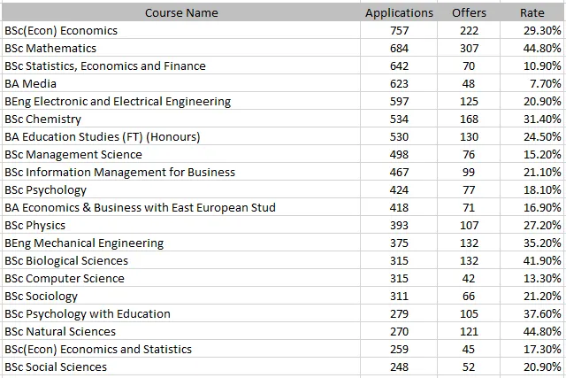 offer最多的专业跟申请人数最多的专业相比,重合的专业只有5个—— 数学、经济、化学、教育研究和电子电气工程EEE 。换句话说,这5个专业是 申请和录取都高的 。