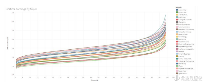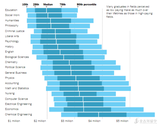 计算机科学和工程确实占据薪酬榜首,但不同专业的薪水差距还是很大的。 “ 学生和家长们很清楚哪种专业的薪水最高,但他们对这些专业内部差异的程度没什么概念。 ” 天普大学研究学术界收入的经济学副教授道格拉斯 ·A· 韦伯说。他举了一个例子:英语专业四分之一收入最高的人群一生中挣到的钱,要多于四分之一收入最低的化学工程师。