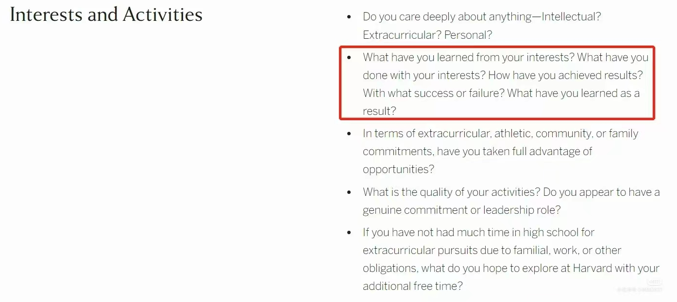 哈佛大学很看重学生的学术与兴趣。你是否对学术、课外活动以及个人兴趣方面的任何事物都具有足够的好奇心?你从兴趣当中学到了什么? 付出了什么?取得了哪些成果?成功还是失败?