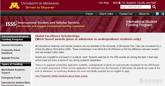 明尼苏达大学为 2019 年秋季入学的本科新生提供 Merit-base 奖学金,全球卓越奖学金能覆盖居民和非居民学费差异的 50% 或全部。国际生申请需要提交语言成绩、高中成绩,完成入学申请,拿 F-1 或 J-1 学生签证。
