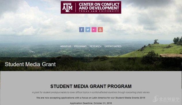 德州农工大学 ConDev 媒体奖学金计划为鼓励新闻摄影记者使用创新方式捕捉争端国家面临的问题。奖学金金额高达 $5,000 ,向全球拥有本科、研究生、博士学位的学生开放申请,在 2018 年 12 月 - 2019 年 5 月期间毕业的学生也可以申请,电子邮件方式申请。