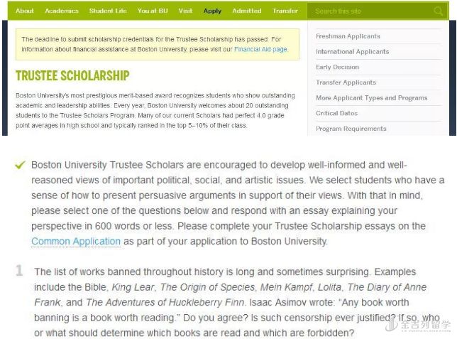 波士顿大学为学业优秀、领导能力突出的优等生提供 Trustee Scholarships ,奖学金覆盖本科生学费,且有机会续签四年。国际生可申请,仅限攻读 BU 本科学位同学,不限专业,名额为 20 名,学术成绩通常在班级排名 5-10% ,竞争激烈。
