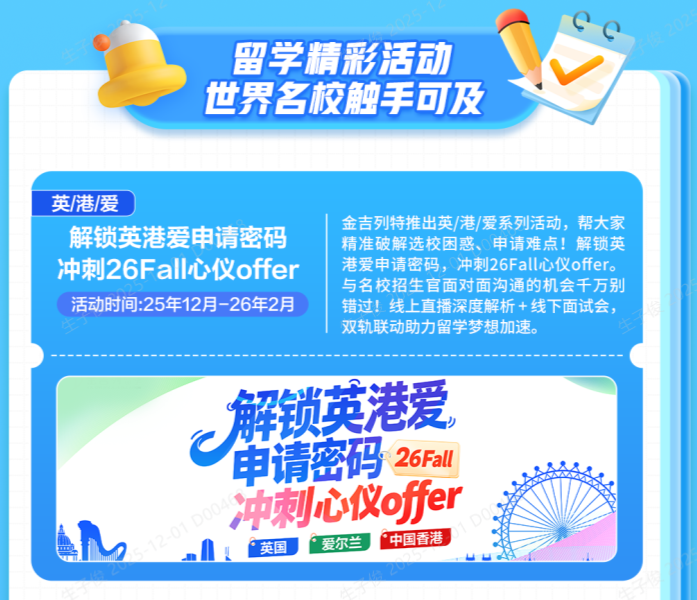 金吉列特推出英/港/爱系列活动,帮大家精准破解选校困惑、申请难点!解锁英港爱申请密码,冲刺26Fall心仪offer。与名校招生官面对面沟通的机会千万别错过!线上直播深度解析+线下面试会双轨穸抱联动助力留学梦想加速。