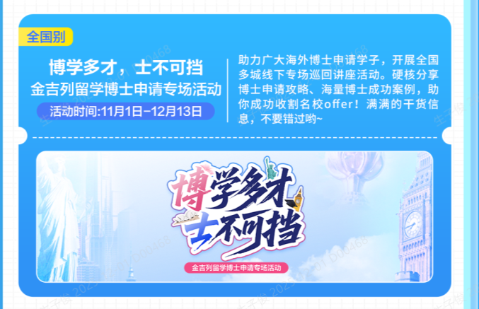 活动四:博学多才,势不可挡,金吉列留学博士申请专场活动(点击了解更多)