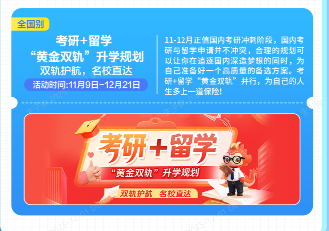 活动六:考研+留学,“黄金双轨”升学规划,双轨护航,名校直达(点击了解更多)