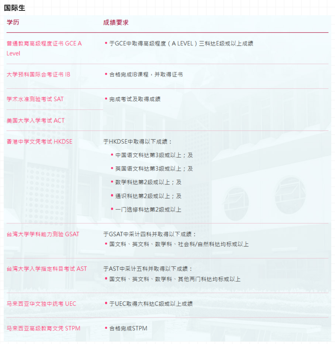 1)持有内地户籍且国际高中(或普通高中国际班)应届毕业并持国际公开考试成绩;(例如 IB,SAT,GCE,A LEVEL,ACT及AP等)之非高考学生。
