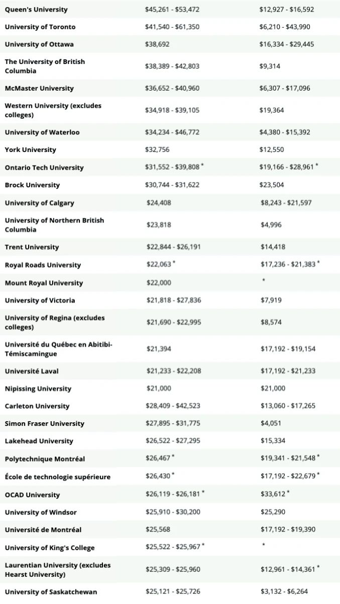 2022-2023 年度艺术与人文专业全日制加拿大留学生的大学学费(加元)