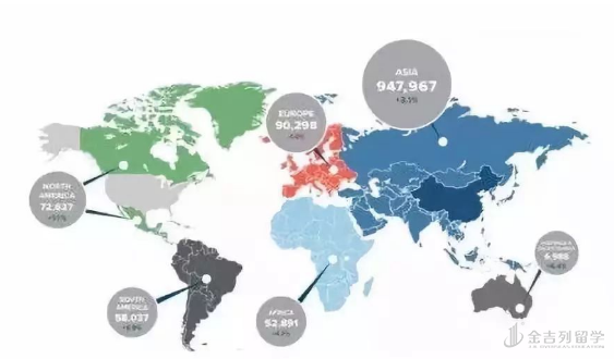 据美国移民和海关执法局 (U.S. Immigration an Customs Enforcement 简称 ICE) 的国际留学生研究数据显示,目前在美国的 8,774 所学校中,一共有 123 万持 F(acaemic ,学术留学 ) 和 M(vocational ,职业留学 ) 类签证的国际留学生。其中 77% 来自亚洲,中国学生约有 40.3 万,中国继续成为赴美留学人数最多的国家。在赴美目的地中,加利福尼亚州 (200,809) 、纽约州 (133,926) 和德州 (86,200) 依然是全美国际学生数量最多的三个州。