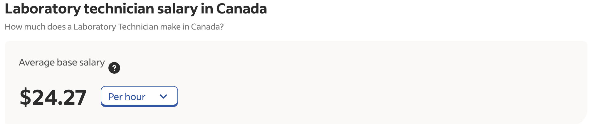 根据indeed的薪酬调查数据显示,在加拿大,生物技术相关职业,如实验室技师的平均时薪为CAD$24.27。