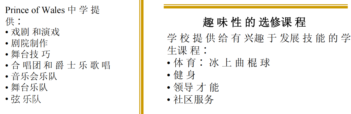 Prince of Wales Secondary School共有 1,200名学生,有着非常优秀的学术课程。学校鼓励学生参与学校的各种课程和活动,并提供给学生全面的教育。选修课程包括服饰与纺织,市场营销,管理,心理学,法律,地理,艺术,平面设计,乐队,合唱团,爵士及词曲创作等。学校同时拥有非常优秀的课外活动,包括各种运动队,俱乐部和社会服务的机会。