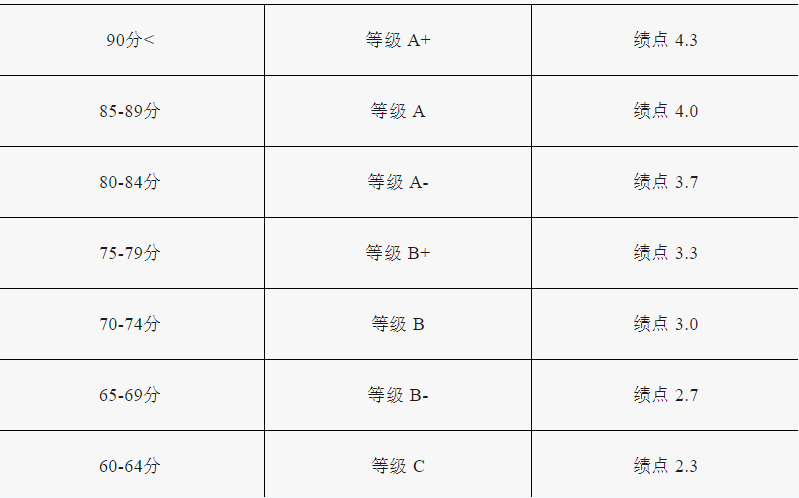 3. 相对于其他国家,加拿大一般是 4分制 、 4.33分制 、 12分制 及 A-C等级制 ,按照加拿大大学的一般算法,中国百分制的成绩可以进行如下换算::