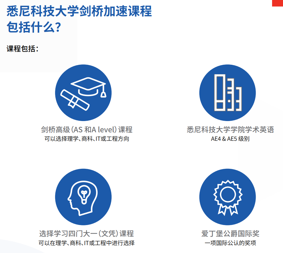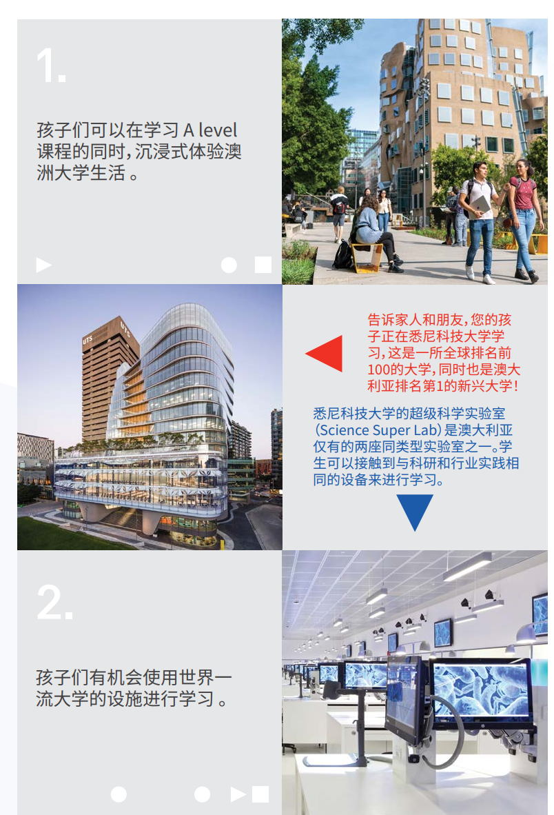 该课程包含全球认可的剑桥AS和A Level课程,以及四门 商科和理工科大一(文凭)课程。 学术英语和爱丁堡公爵国际奖,即领导力和生活技能培养 项目也被纳入课程,让学生可以快速建立信心,加快学习 进度。 所有课程都将在位于澳大利亚悉尼市中心的世界级大 学——悉尼科技大学的校园内进行