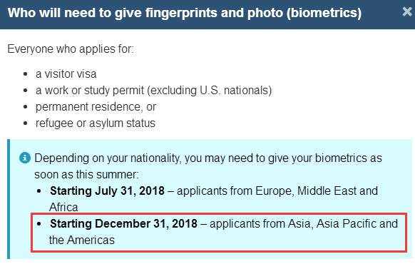 2.来自亚洲、亚太和美洲的申请人将于 12月31日起 ,在申请加拿大签证时须亲赴签证中心录指纹。