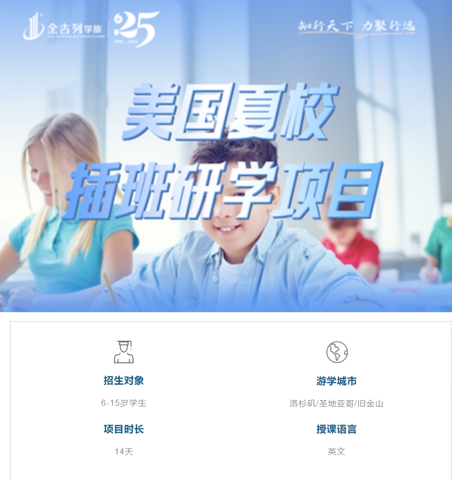 2024年这个夏天,金吉列重磅回归,精心策划并推出插班夏校研学项目, 旨在让有梦过梦想的孩子们,提前感受美国的教育和熏陶,开启研学新体验!在世界强国的熏陶中成就非凡自己,找到通向卓越的路径,向成功迈进,助力未来留学。