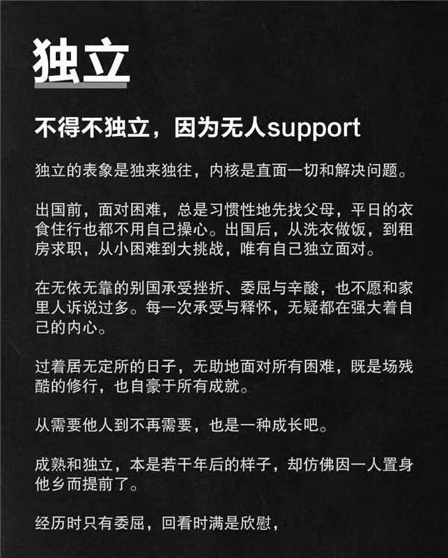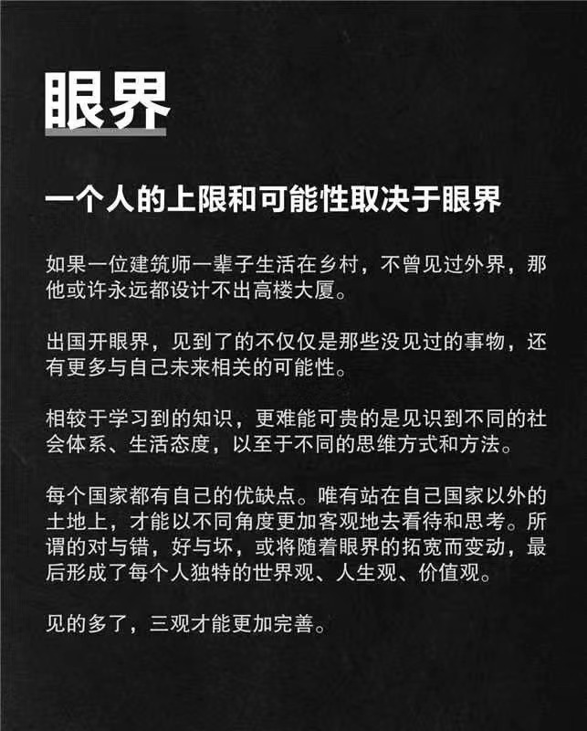 “如果一定要把留学说成镀金,那么留学所镀的金不是学历,是经历,而是眼界,胸怀。在国外读个几年书,看世界、看中国、包括看自己的眼光和思维自然都会有不少的变化”。