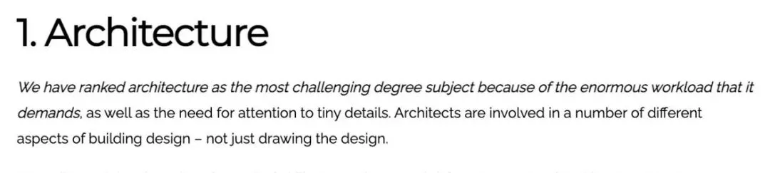 在这个2023年度英国大学最难学排行榜中,建筑学夺得了第一名。这大概是因为学习建筑专业需要掌握多个领域的知识,比如艺术、设计、工程、历史和商业等。同时你还需要完成大量的实际操作工作,这会大大增加学习任务量和时间投入。