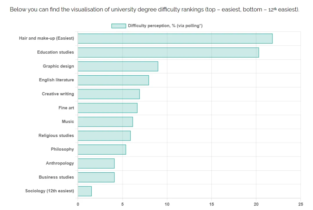 4.11% 的民意调查认为人类学学位是最简单的本科学位,位列第10位。