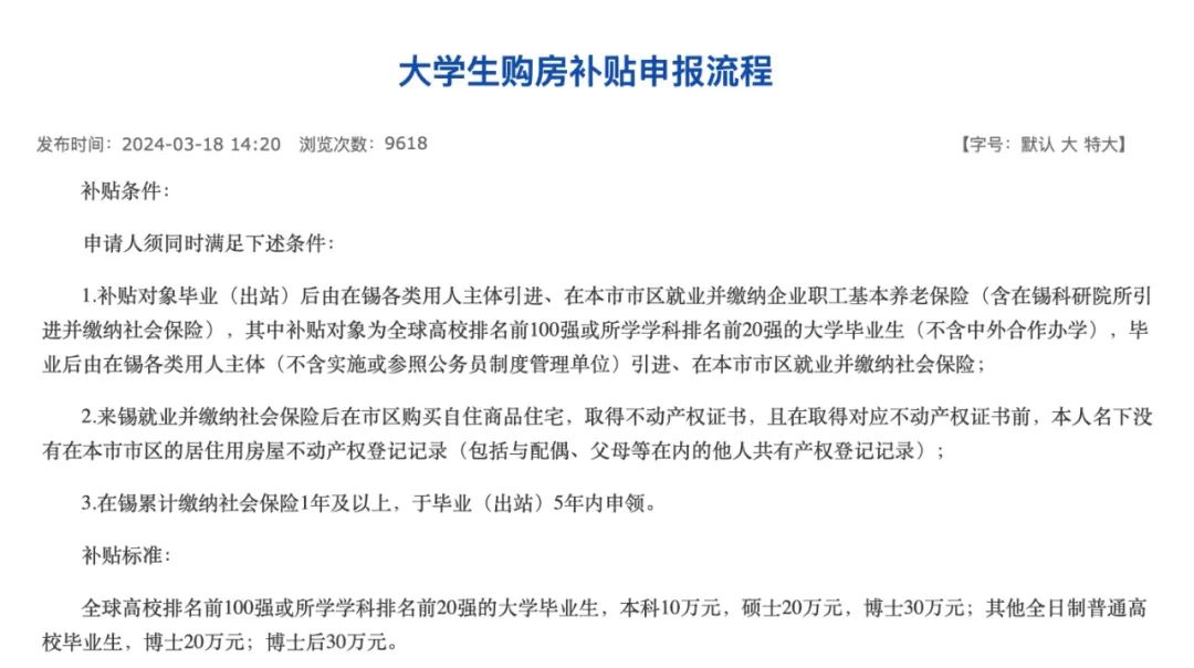 例如江苏无锡,通过江苏人社网办大厅可以查询到,如果留学生回 无锡购房 的话, 本科补贴10万元,硕士补贴20万元,博士补贴30万元 。这对于想要毕业购房的留学生来说,福利力度相当大了!