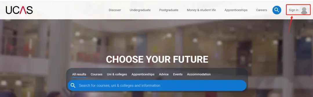 进入UCAS官网(www.ucas.com),页面右上角点击【Sign in】按钮