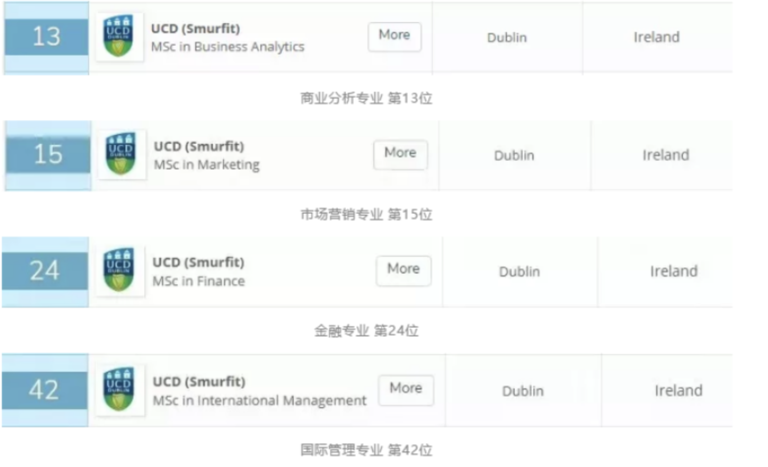 除此之外,QS 2019年全球商科硕士排名(QS Business Masters Rankings 2019)中,UCD所有商科专业均排到TOP50。