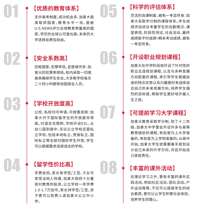 主要从教育体系、安全系数、学校分开放度、留学性价比、评估体系、职业规划课程、可提前学习大学课程、丰富的课外活动等方面进行介绍。