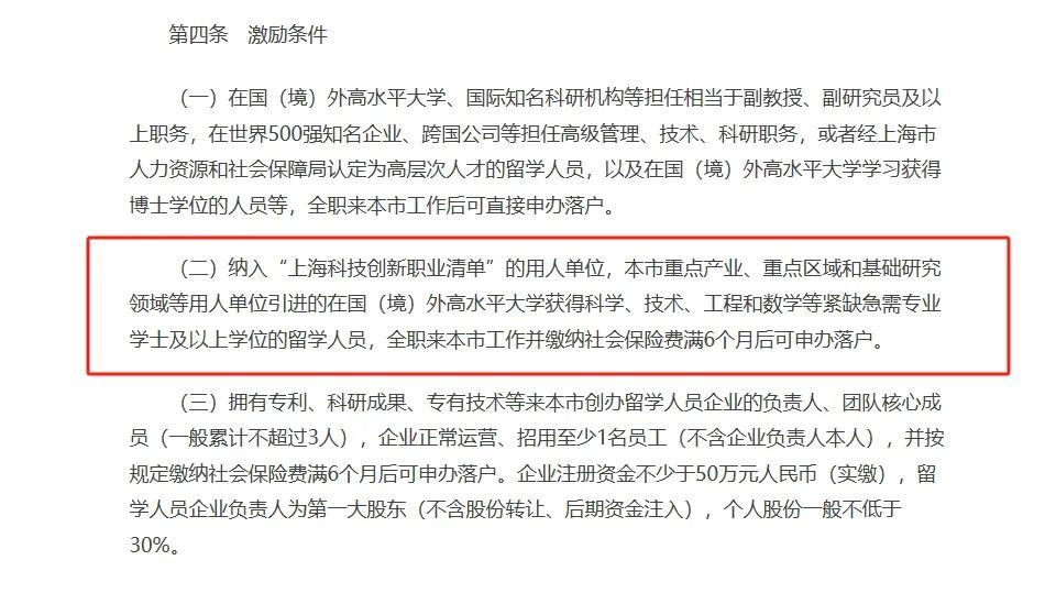 根据《留学回国人员申办上海常住户口实施细则》中的紧缺型人才激励条件,STEM领域的留学生只要满足两点条件,便可以在上海工作并 缴纳6个月社保后,无需再受个税和社保基数限制,直接申请落户。