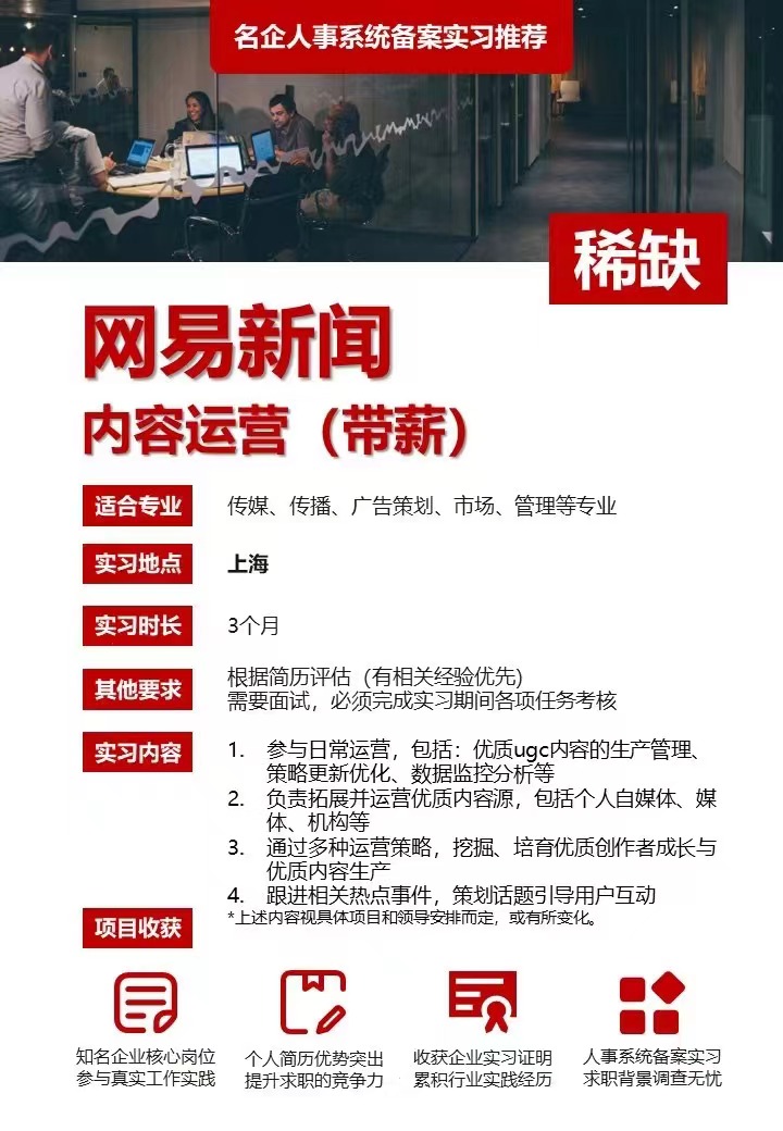 网易新闻-内容运营-上海实习期3个月福利-带薪有工牌7月初可以入职仅2个名额