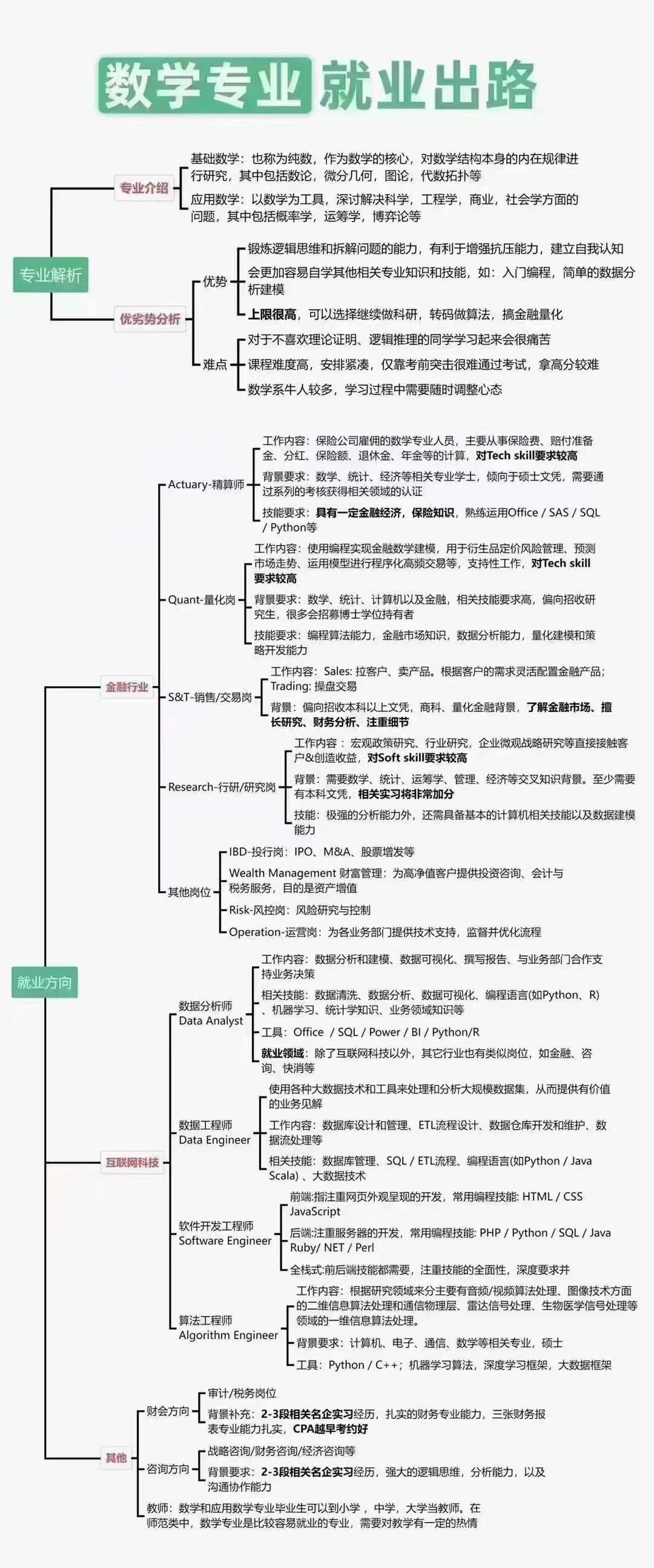 1、应用数学( Applied Mathematics)包括:控制论、信息论、计算化学、数理生物学、数理经济学、计量经济学、数理金融学、数学心理学、数学物理学等,是以应用为目的的明确的数学理论和方法的总称,研究如何应用数学知识到其他范畴(尤其是科学)的数学分支,可以说是纯数学的相反,应用纯数学中的结论扩展到物理学等其他科学中,应用数学的发展是以科学为依据,作为科学研究的后盾。应用数学专业内,因为部分方向广泛被人研究和参与人数庞大,应用数学系很多时候会让一些学科独立出来作为专业进行招生,如统计学和计算科学。