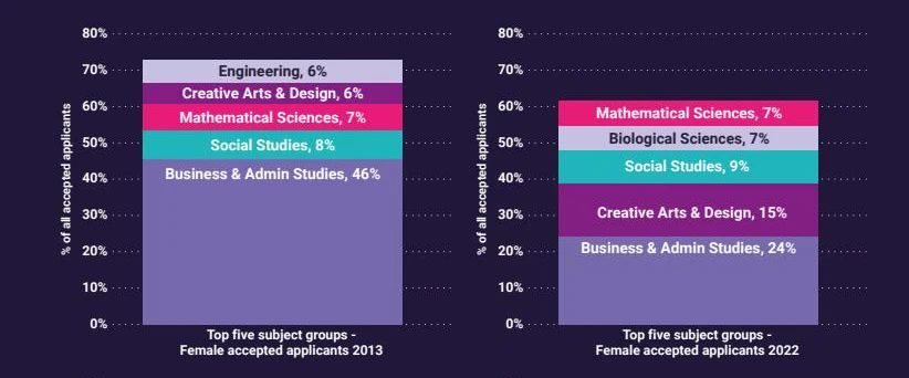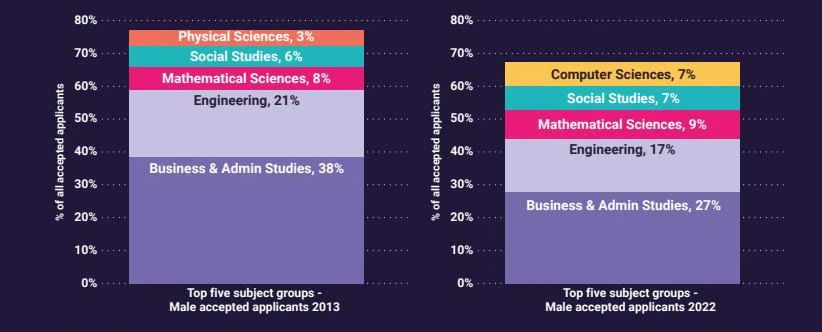 但我们也能从报告中看出,热门专业的趋势正在发生变化。商科虽然仍是申请者最多的专业,但是不论男女,从 13 年与 22 年的数据对比, 商科申请者占比都在显著下滑。