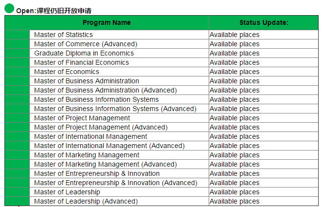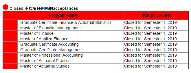 以下为澳国立大学 College of Business an Economics (CBE)发来的最新的关于2019年Semester 1 各个课程的满位情况。